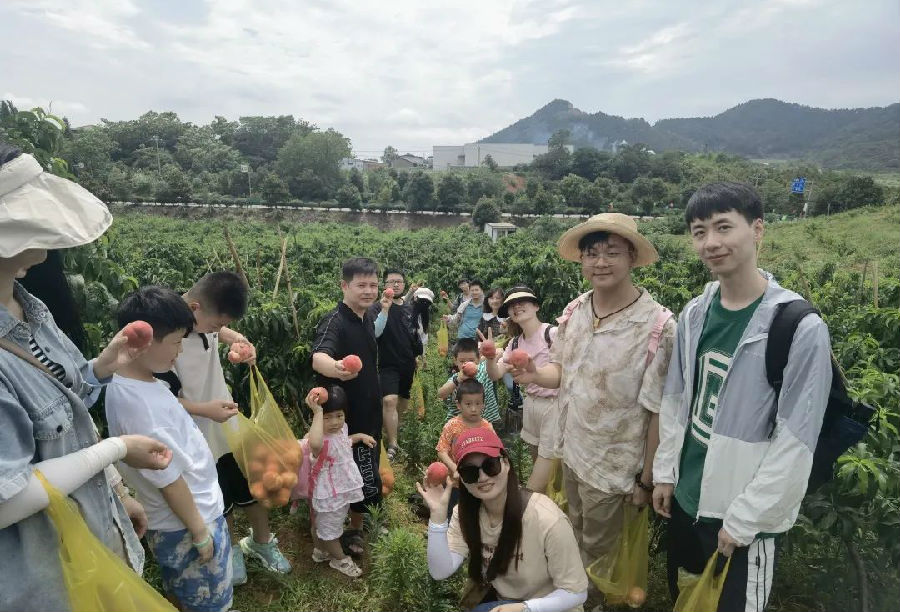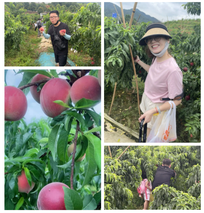 紅桃掛滿枝,笑迎八方客。上午九時(shí)許,大家統(tǒng)一出發(fā)來(lái)到廬山西海生態(tài)農(nóng)莊,前往果園采摘新鮮可口的大水蜜桃,碩大飽滿、絳紅欲滴的水蜜桃掛滿枝頭,伴隨著徐徐清風(fēng),濃郁的果香飄滿山間。
