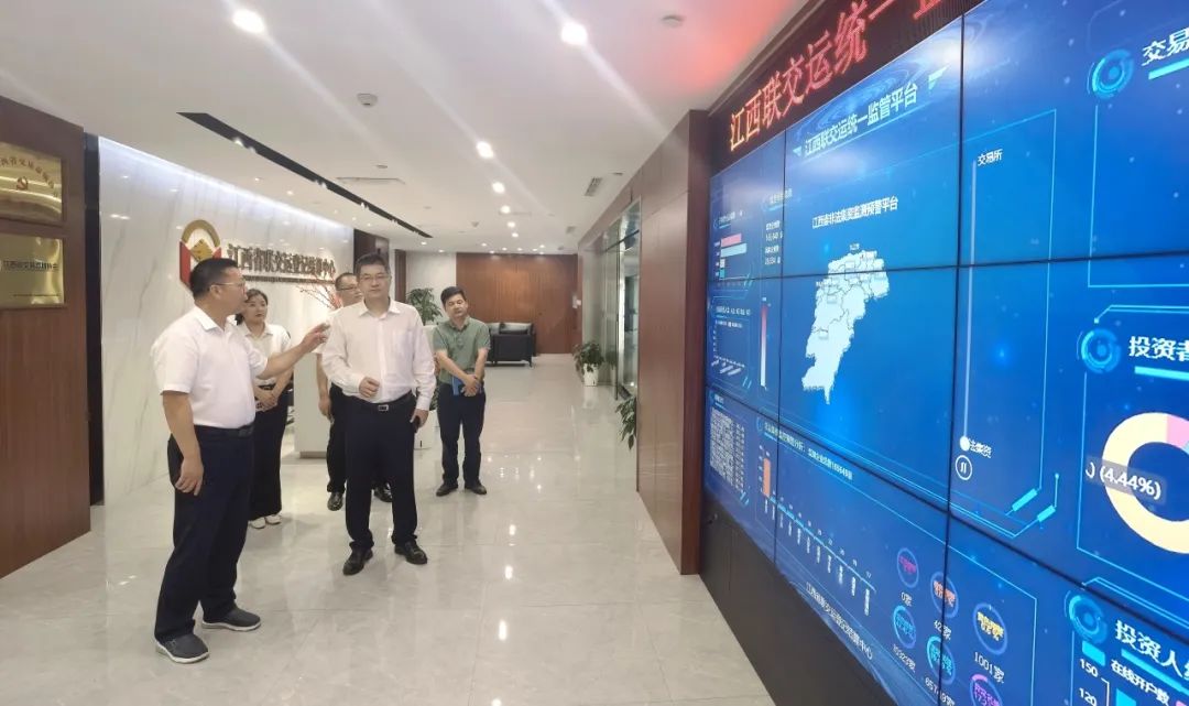 陳偉一行首先觀摩了公司輔助監(jiān)管信息展示大屏,詳細(xì)了解公司“統(tǒng)一監(jiān)管平臺(tái)”、“贛金鷹眼平臺(tái)”、“贛金衛(wèi)士平臺(tái)”等輔助監(jiān)管平臺(tái)建設(shè)案例成果并表示贊賞。