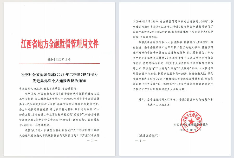 根據(jù)省委組織部 省金融監(jiān)督管理局黨組《關(guān)于進(jìn)一步激勵(lì)全省金融領(lǐng)域廣大干部在防范化解重大金融風(fēng)險(xiǎn)攻堅(jiān)戰(zhàn)中展現(xiàn)新?lián)?dāng)實(shí)現(xiàn)新作為的工作方案》(簡(jiǎn)稱工作方案)(贛金黨字〔2019〕17號(hào)),省金融監(jiān)管局牽頭組織開(kāi)展了全省金融領(lǐng)域(2023年二季度)擔(dān)當(dāng)作為先進(jìn)典型推薦報(bào)送及評(píng)選工作。