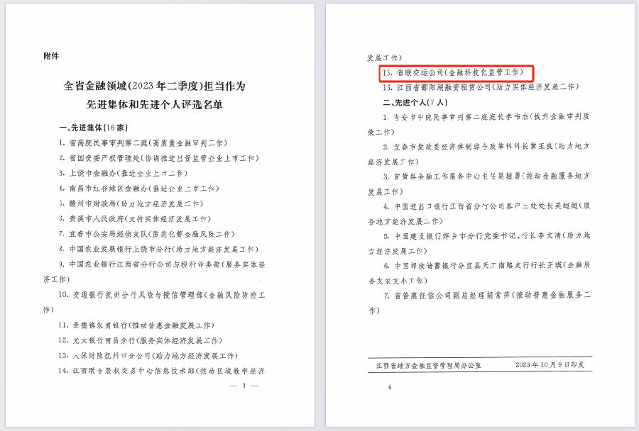 10月9日,省金融監(jiān)督管理局印發(fā)《關(guān)于對(duì)全省金融領(lǐng)域(2023年二季度)擔(dān)當(dāng)作為先進(jìn)集體和個(gè)人通報(bào)表?yè)P(yáng)的通知》,省聯(lián)交運(yùn)公司(金融科技化監(jiān)管工作)獲評(píng)全省金融領(lǐng)域(2023年二季度)擔(dān)當(dāng)作為先進(jìn)集體。