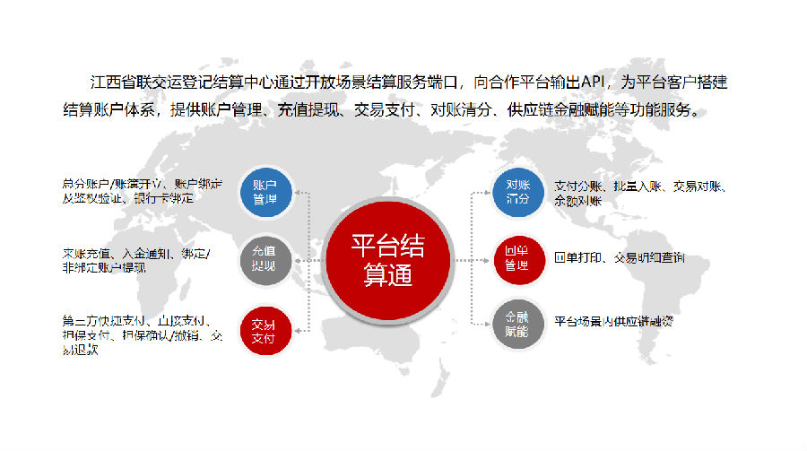 “平臺(tái)結(jié)算通”是公司作為第三方資金存管結(jié)算平臺(tái),通過(guò)與多家結(jié)算銀行/支付機(jī)構(gòu)系統(tǒng)直連,為各類交易平臺(tái)搭建統(tǒng)一的賬戶管理體系,向平臺(tái)及平臺(tái)用戶提供總分賬戶管理、充值提現(xiàn)、交易支付、對(duì)賬清分、供應(yīng)鏈金融賦能等一體化資金管理服務(wù),為不同的垂直行業(yè)/業(yè)務(wù)場(chǎng)景提供全鏈路資金“收+管+付”服務(wù)解決方案。目前,平臺(tái)結(jié)算通產(chǎn)品在接入南方林業(yè)產(chǎn)權(quán)交易所、江西旅游文化交易中心等省內(nèi)部分交易場(chǎng)所基礎(chǔ)上,并陸續(xù)成功對(duì)接了多家醫(yī)藥流通、網(wǎng)絡(luò)貨運(yùn)等產(chǎn)業(yè)平臺(tái),已成為公司服務(wù)我省交易場(chǎng)所轉(zhuǎn)型發(fā)展及助力相關(guān)產(chǎn)業(yè)平臺(tái)數(shù)字化升級(jí)發(fā)展的核心業(yè)拳頭產(chǎn)品。