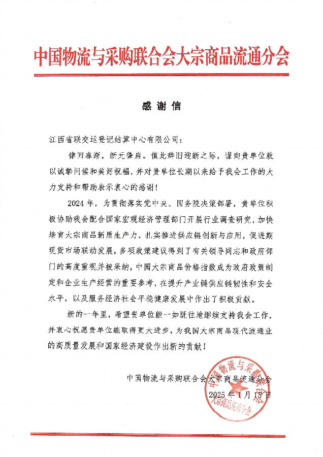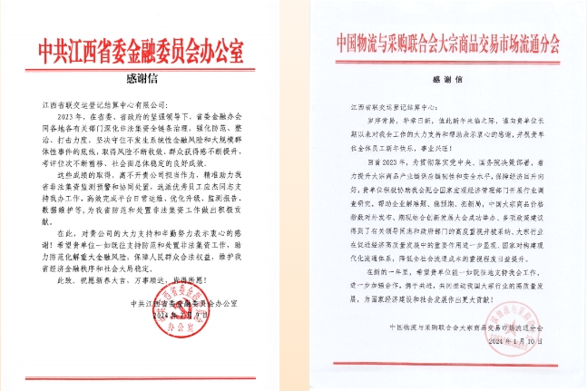 新春前夕,江西聯(lián)交運(yùn)先后收到來(lái)自中國(guó)物流與采購(gòu)聯(lián)合會(huì)大宗商品交易市場(chǎng)流通分會(huì)和中共江西省委金融委員會(huì)辦公室發(fā)來(lái)的感謝信,分別對(duì)公司長(zhǎng)期以來(lái)服務(wù)并推動(dòng)大宗行業(yè)高質(zhì)量發(fā)展及擔(dān)當(dāng)作為、精準(zhǔn)助力為我省防范和處置非法集資工作做出的積極貢獻(xiàn)表示表達(dá)充分肯定和感謝。