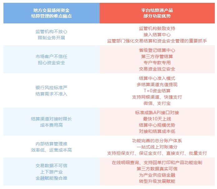 平臺(tái)結(jié)算通目前已成功對(duì)接服務(wù)多家地方交易場(chǎng)所、醫(yī)藥購(gòu)銷(xiāo)平臺(tái)、網(wǎng)絡(luò)貨運(yùn)平臺(tái)及產(chǎn)業(yè)電商平臺(tái)等,有效幫助解決相關(guān)交易平臺(tái)資金結(jié)算管理等難點(diǎn)痛點(diǎn)問(wèn)題。以地方交易場(chǎng)所行業(yè)為例:受監(jiān)管政策趨嚴(yán)并行業(yè)發(fā)展良莠不齊等多重因素影響,近年來(lái)地方交易場(chǎng)所行業(yè)一直處于規(guī)范調(diào)整中,如何讓監(jiān)管部門(mén)提振行業(yè)發(fā)展信心、讓客戶放心安心交易成為各類交易平臺(tái)的痛點(diǎn)難點(diǎn)問(wèn)題。公司推出的平臺(tái)結(jié)算通產(chǎn)品在多方面解決了以下諸多問(wèn)題,在助力地方交易場(chǎng)所行業(yè)轉(zhuǎn)型升級(jí)健康發(fā)展等方面發(fā)揮了重要作用。