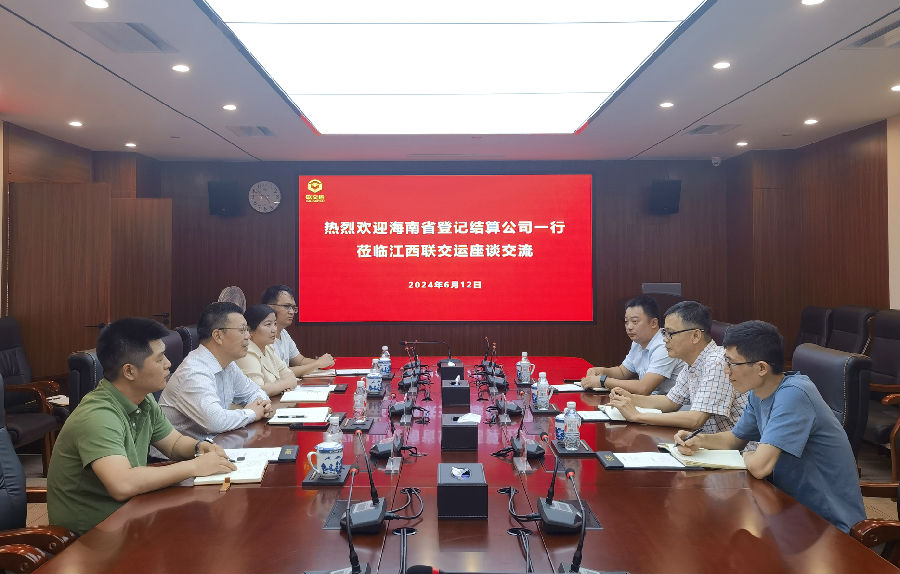 6月12日,海南省登記結(jié)算有限責(zé)任公司(以下簡(jiǎn)稱“海南結(jié)算”)董事長(zhǎng)文于佳一行蒞臨江西聯(lián)交運(yùn)座談交流,公司董事、總經(jīng)理劉祖國(guó),副總經(jīng)理羅莉及相關(guān)部門(mén)負(fù)責(zé)同志現(xiàn)場(chǎng)接待并座談交流。