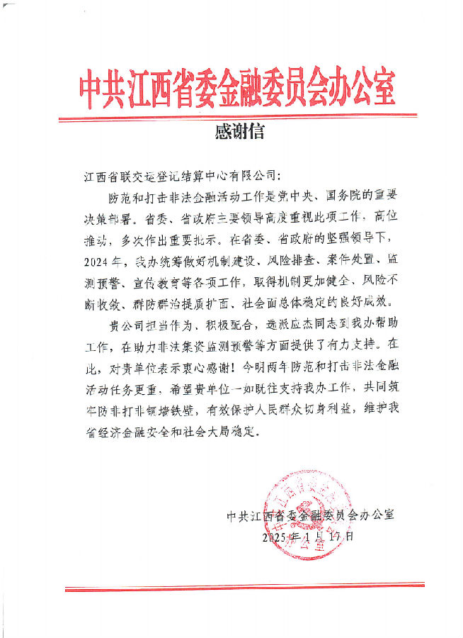 近日,江西聯(lián)交運(yùn)連續(xù)收到來(lái)自中共江西省委金融委員會(huì)辦公室和中國(guó)物流與采購(gòu)聯(lián)合會(huì)大宗商品流通分會(huì)發(fā)來(lái)的感謝信,分別對(duì)公司多年以來(lái)持續(xù)服務(wù)并建設(shè)運(yùn)營(yíng)好“贛金鷹眼”江西省非法集資監(jiān)測(cè)預(yù)警平臺(tái),助力我省防范和處置非法集資監(jiān)測(cè)預(yù)警以及在培育大宗商品新質(zhì)生產(chǎn)力、推進(jìn)供應(yīng)鏈創(chuàng)新與應(yīng)用等方面做出的積極貢獻(xiàn)表示表達(dá)肯定和感謝。